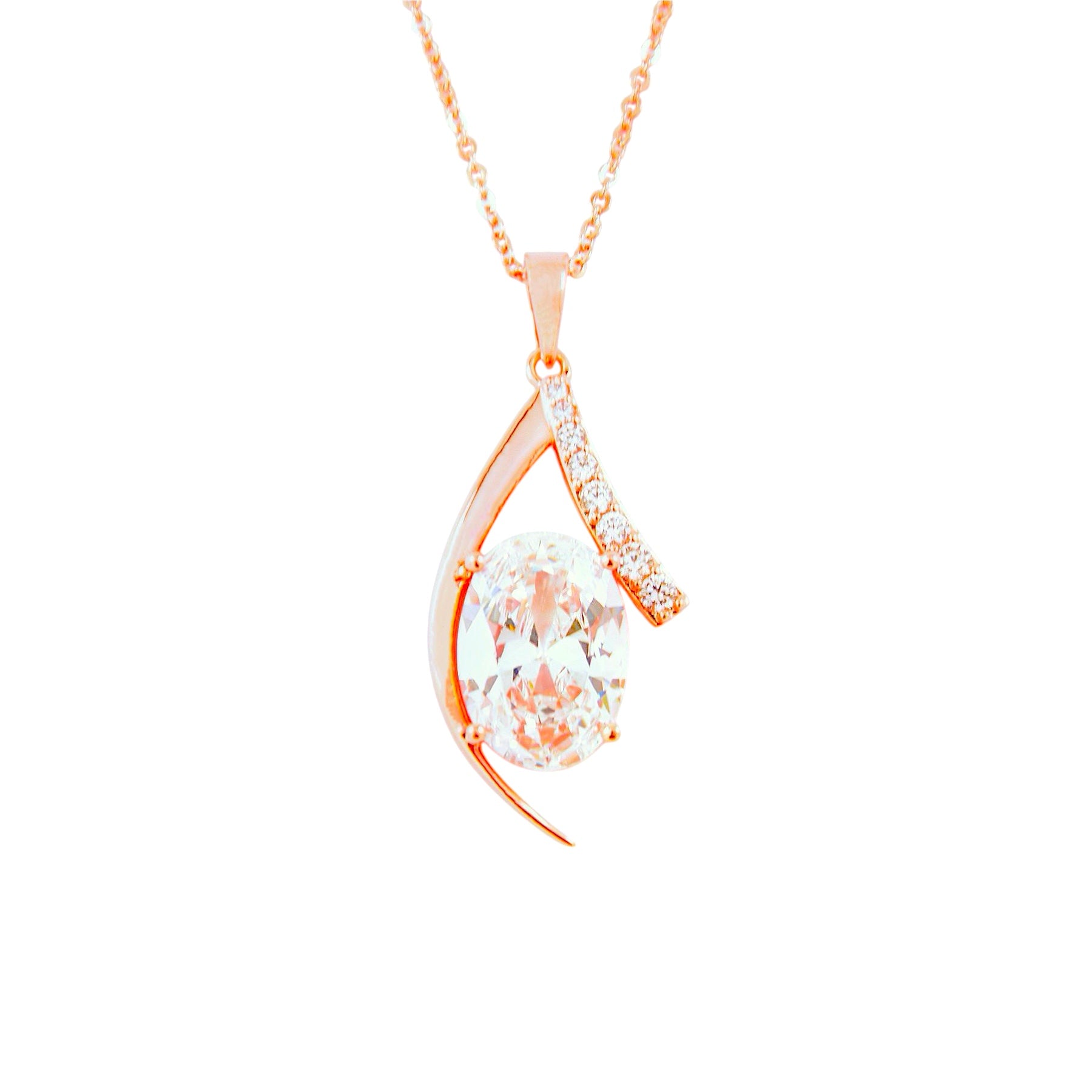 Rose plated half moon pendant with large oval brilliant cut crystal stone. A real statement piece.